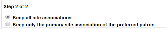 - If you are a district user with the Manage Patrons for the District permission and the patron records have different or multiple site associations, select whether to keep all the associations, or just the primary association of the preferred record.